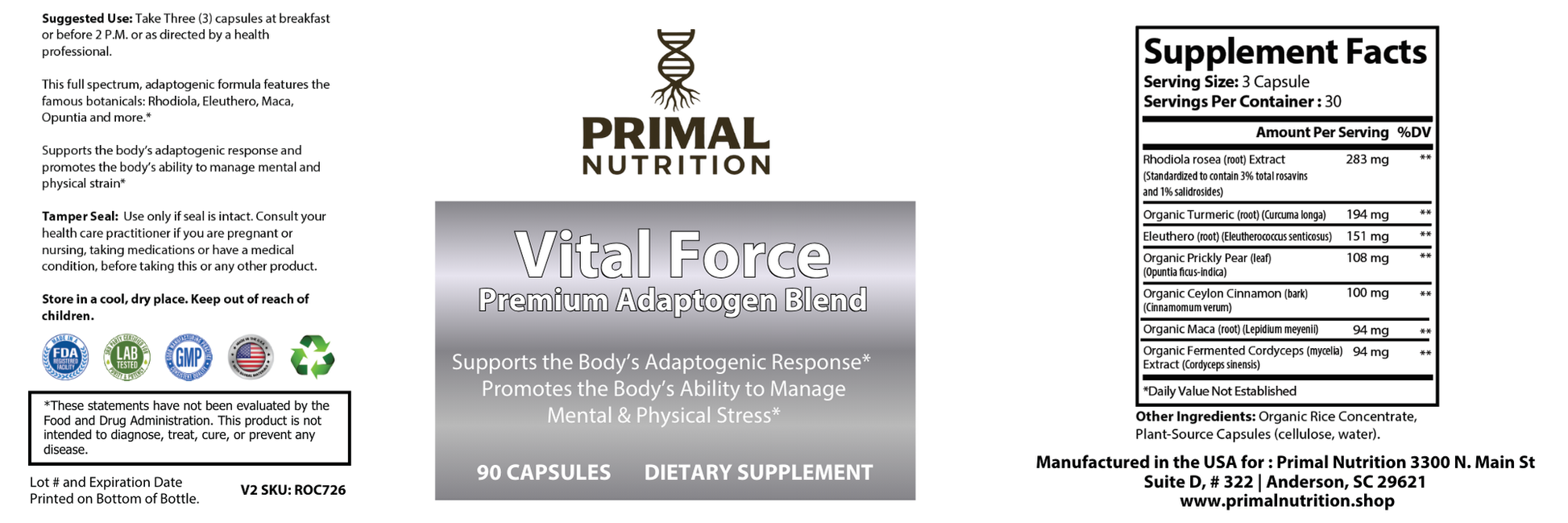 Vital Force by Primal Nutrition is a powerful adaptogenic formula crafted to help your body adapt, endure, and thrive under modern stress. This synergistic blend combines Rhodiola Rosea, Eleuthero (Siberian Ginseng), and other time-tested botanicals to support energy, focus, and hormonal balance — without the crash.